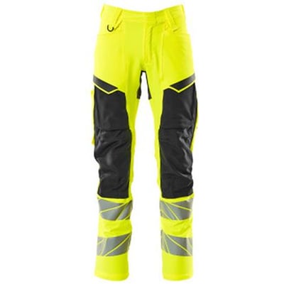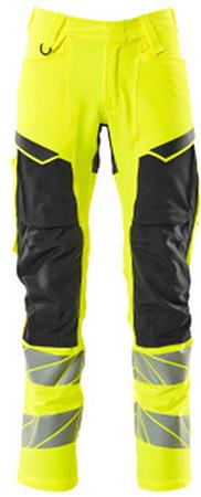 Disse HI-VIS bukser i gul/sort kombinerer fluorescerende materialer med reflekser for optimal synlighed. Den vandafvisende finish sikrer komfort under varierende vejrforhold, mens det tofarvede design giver et professionelt udseende. Fremstillet af et ultimativt strækstof, der er letvægts og samtidig yderst slidstærkt. Tonålssømme på ben og i skridt bidrager til øget holdbarhed, og knaplukningen er skjult for et rent look.
