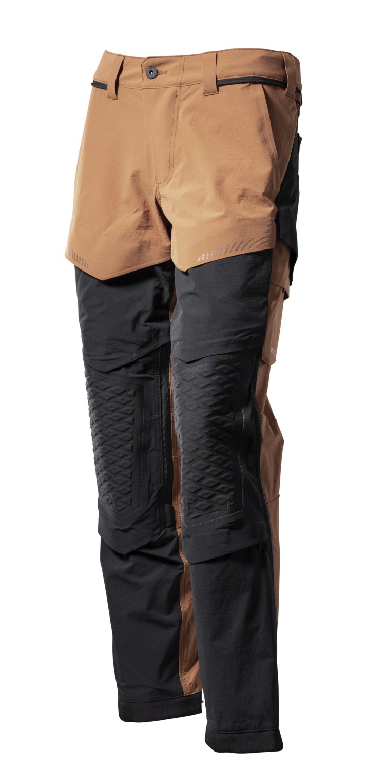 Mascot arbejdsbukser i stretch materiale, brun/sort, med plads til knæpuder. Øko-tex certificeret.