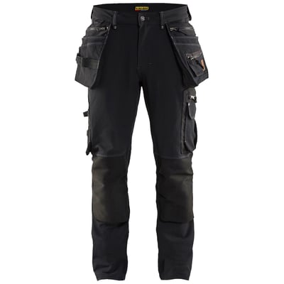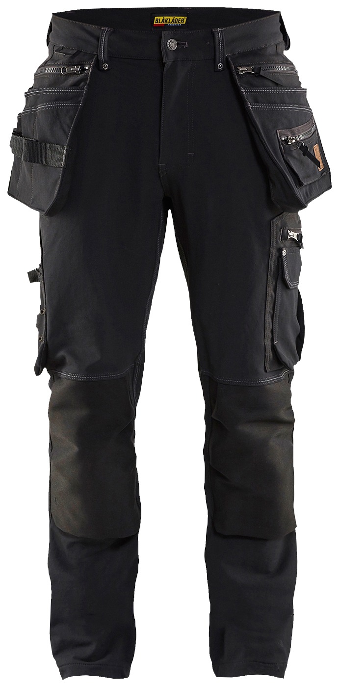 Slidstærke Blåkläder arbejdsbukser i sort stretch materiale. Bukserne har forstærkede sømlommer, tommestoklomme og knælommer. Ideelle til håndværk og havearbejde.