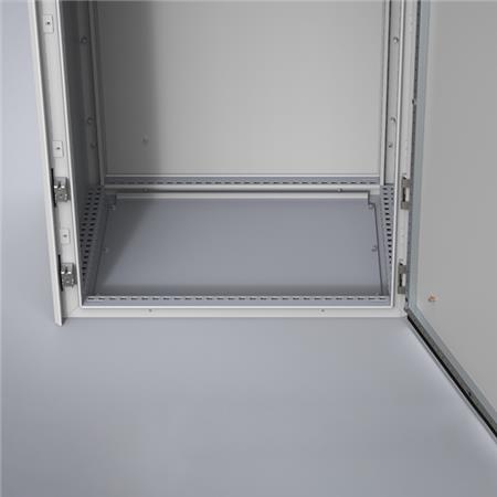 Bundplade i et stykke, udført i aluminium AlMg3 med en tykkelse på 2 mm. Overfladebehandlet med RAL 7035 pulverlakering.