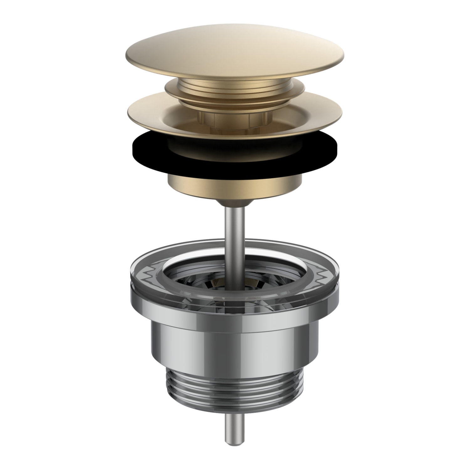 LAUFEN bundventil med klik-funktion og en slidstærk PVD-overflade i bleget guld, der modstår ridser og misfarvning. Velegnet til håndvaske.