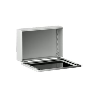 Dette bus-kabinet fra Rittal er udført i stålplade og har dimensionerne 400x300x155 mm. Kabinettet er designet med en lukket bund og et hængslet låg, der giver nem adgang til indholdet. En integreret glasplade giver mulighed for visuel inspektion uden at åbne kabinettet.