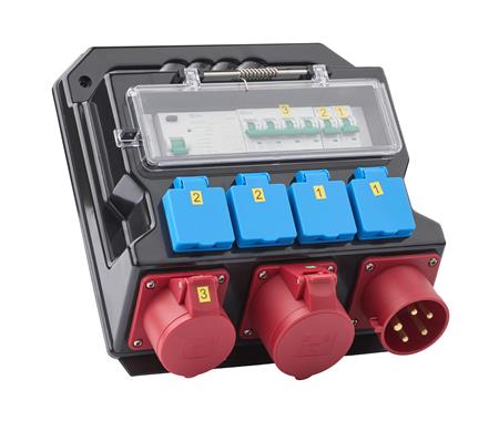 Robust byggestrømtavle med CEE 400V/32A indgang, 4x Schuko 230V/32A og 1x CEE 400V/16A udtag. Inkluderer automatsikringer, HPFI og slagfast IP44 kapsling.