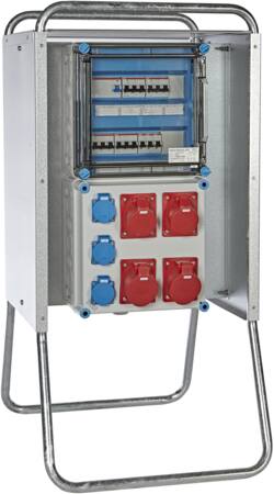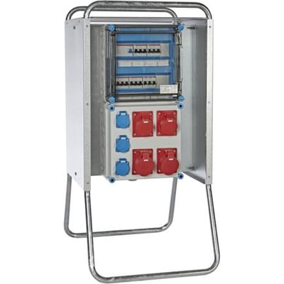 Robust byggepladstavle med stikbensmåling, 63A. Udstyret med 3 x DK 230V/13A, 2 x CEE 400V/16A og 2 x CEE 400V/32A udtag.