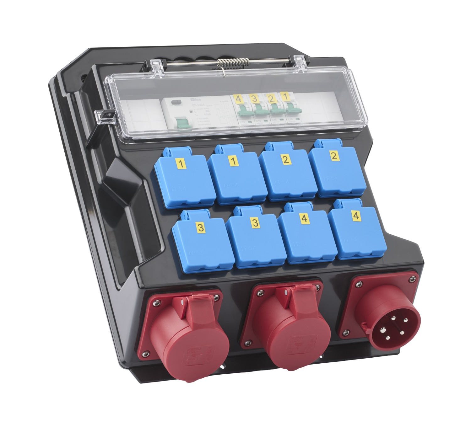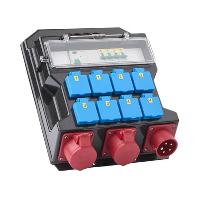 Byggepladstavle 16A med 1x16A CEE indtag, 1x16A CEE stik, 1x16A afsikret CEE stik og 8x16A 230V stik med dansk jord. IP44.