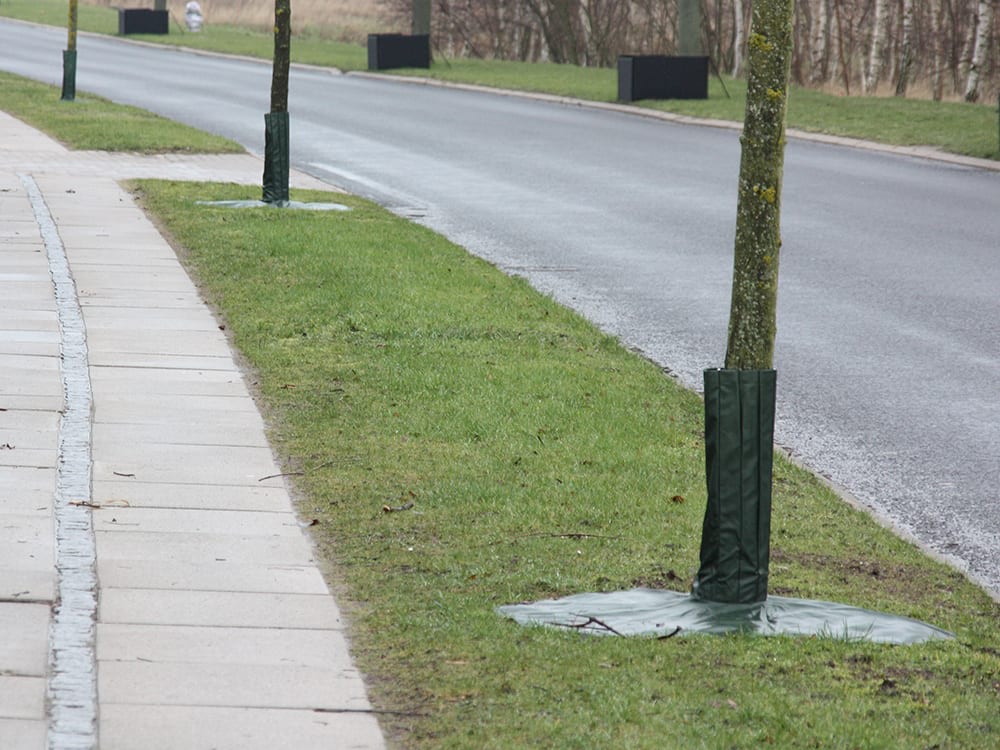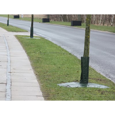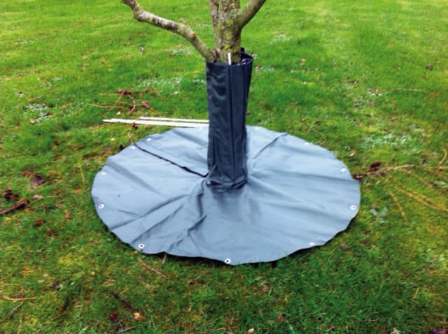 Ukrudtsskørt fra Byggros til træstammer. Vandgennemtrængelig tekstil, der holder ukrudt væk. Diameter: 1200 mm. Med velcro og monteringsringe. Kravehøjde: 150 mm, justerbar til stammer Ø60-250 mm.