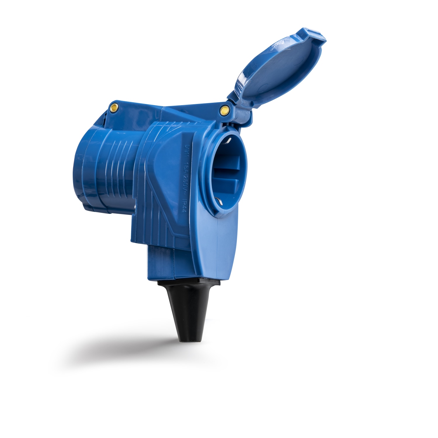 Dette CEE vinklede forlængerled er ideelt til campingbrug og er udstyret med en Schuko stikdåse med klap.