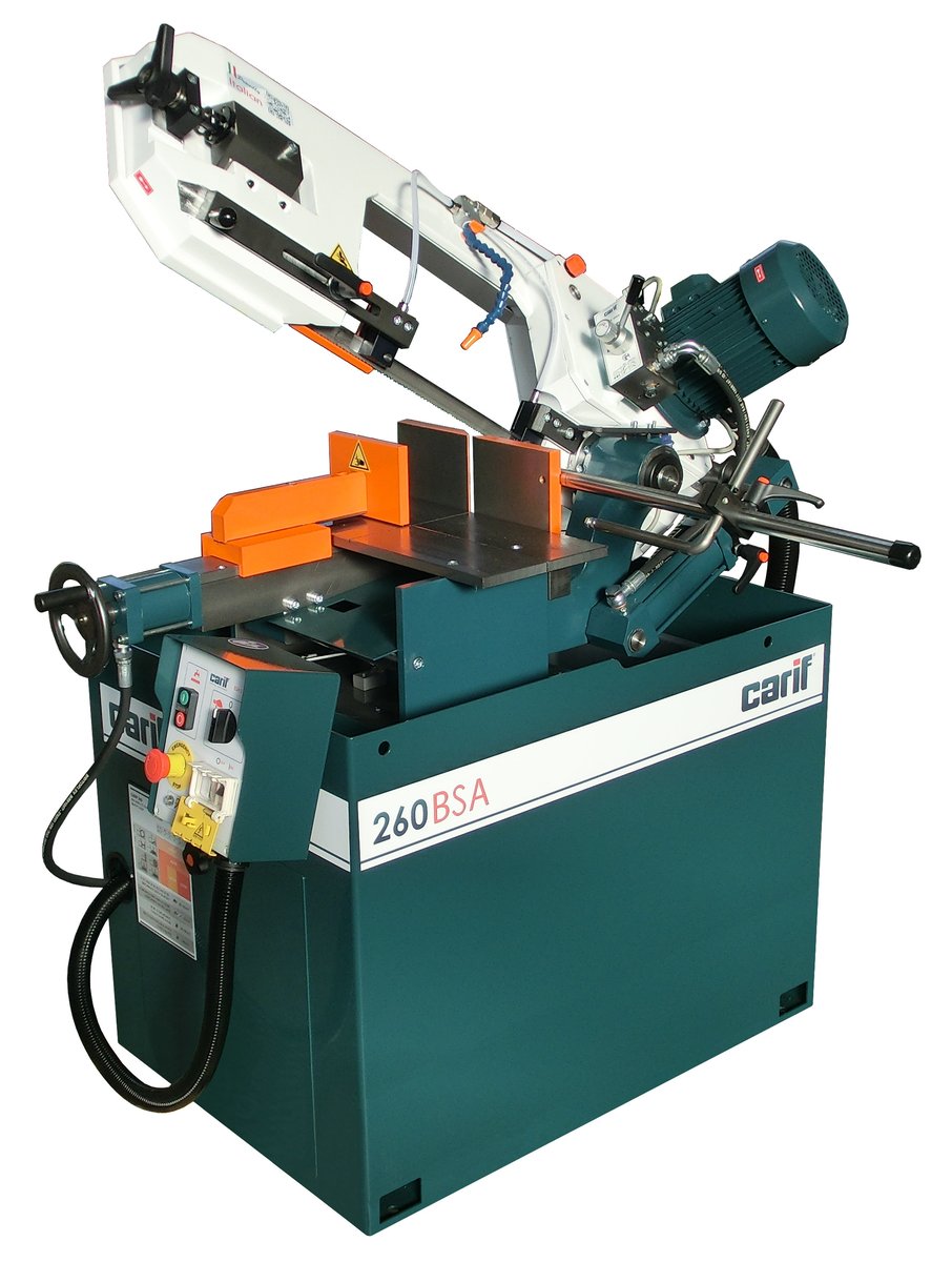 Carif 260 Bsa halvautomatisk båndsav med robust metalstruktur og hydraulisk mekanisme. Smigsavning fra -45°/+60°. Kølevæskebeholder på 50 liter.