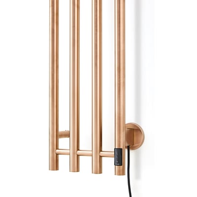 Elegant håndklædetørrer i børstet kobber med timerfunktion. Ideel til badeværelset med en bredde på 260 mm og højde på 1420 mm.
