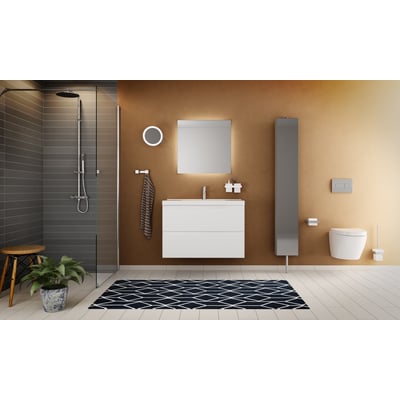 Med integreret greb og soft close funktion, sikrer dette underskab en stille og elegant lukning af skufferne. Den foliebelagte overflade giver en holdbar og let rengøringsvenlig finish, hvilket gør det til et ideelt valg for både badeværelser og køkkener.