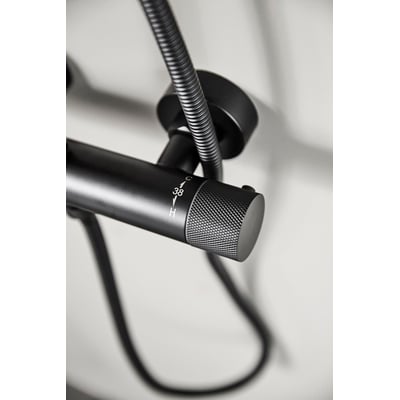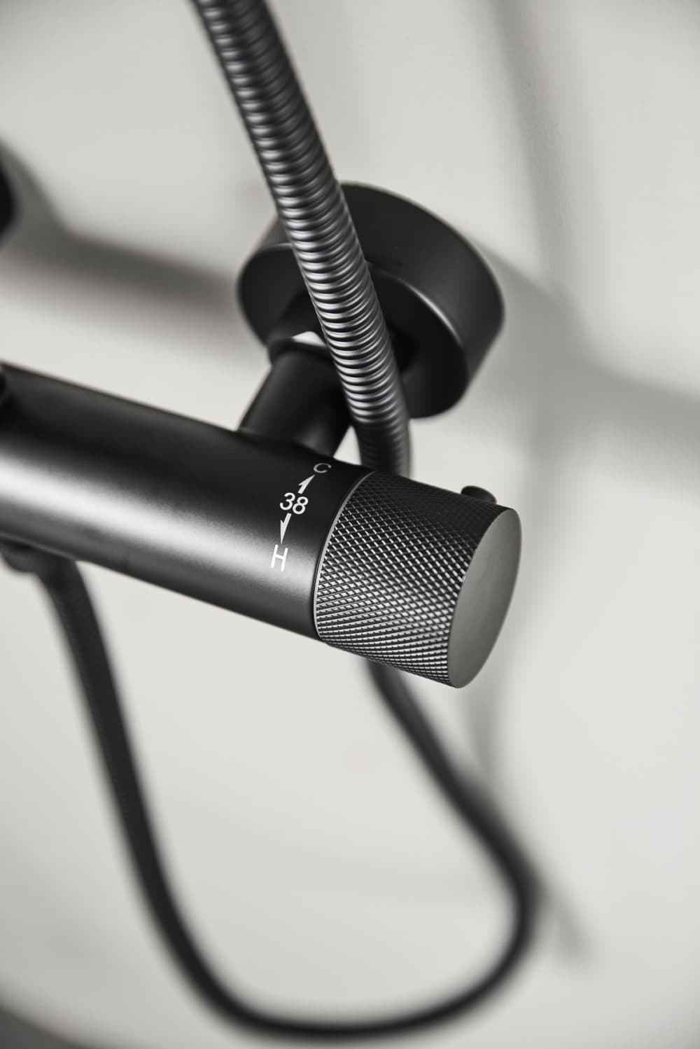 Cassøe T8 brusesæt i mat sort med crystal cut. Inkluderer termostat, 2-grebs betjening og rund hovedbruser.