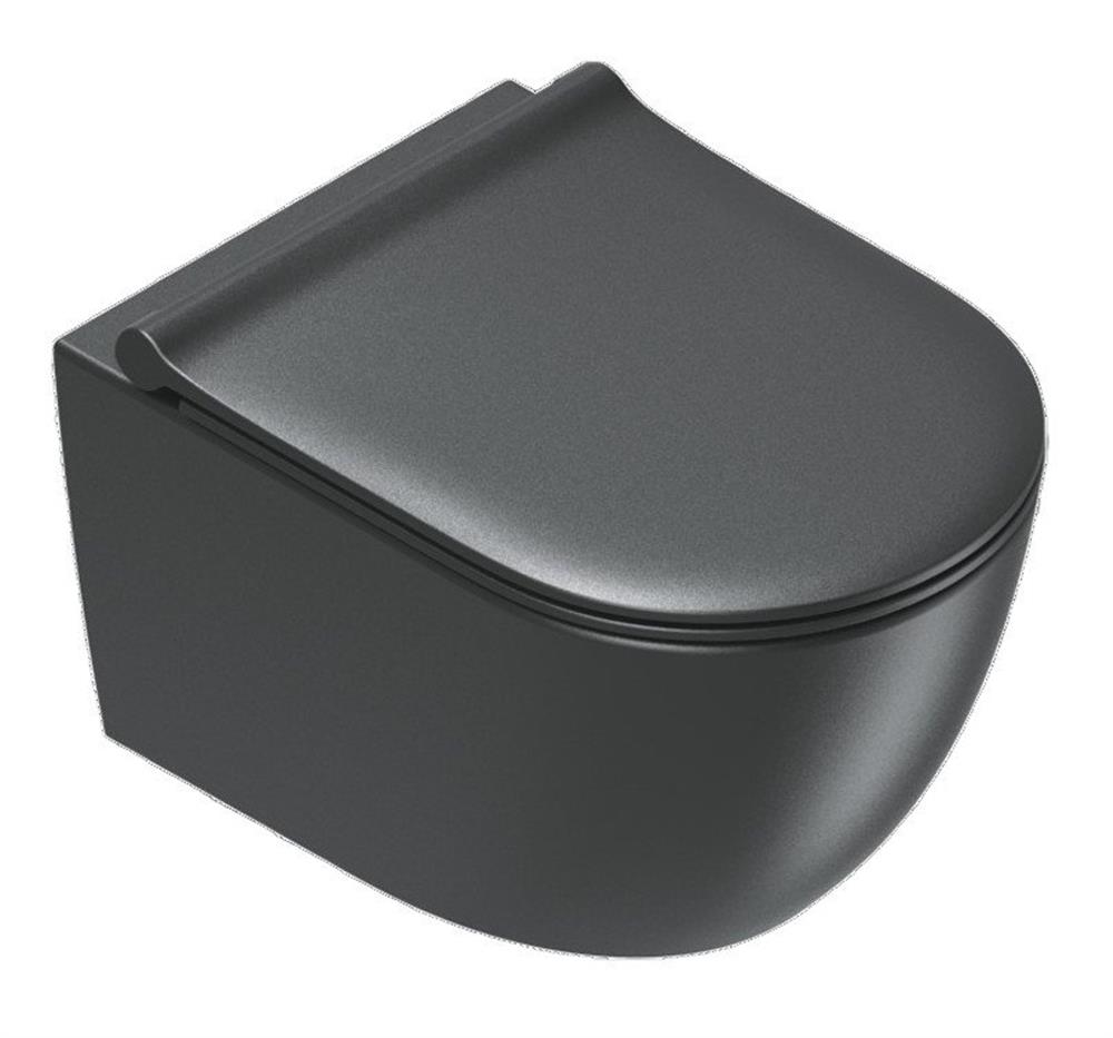 Elegant Sfera vægtoilet fra Catalano i mat sort satin. Med Silentech skyllefunktion, skjult montering og rengøringsvenlig overflade. Mål: 50x35 cm.