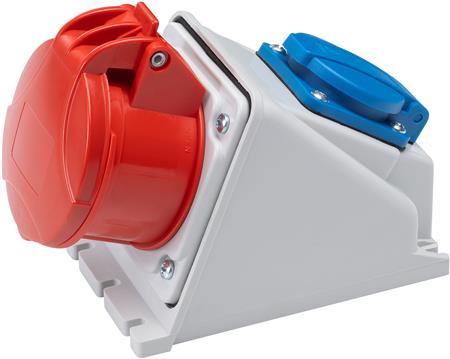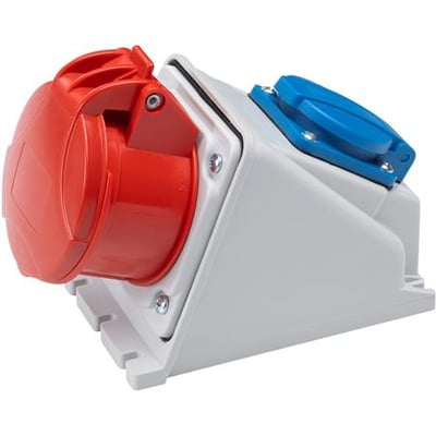 CEE kombi med dansk stikkontakt og 16A, 5-polet udtag til 400V. Leveres med kabelindgang i top (PG16) og bund, IP44 og IK8 klassificering.
