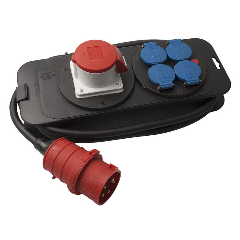 Kompaktforgrener med 400V/16A/5p tilgang og 400V/16A + 4x DK udtag med 2M kabel.