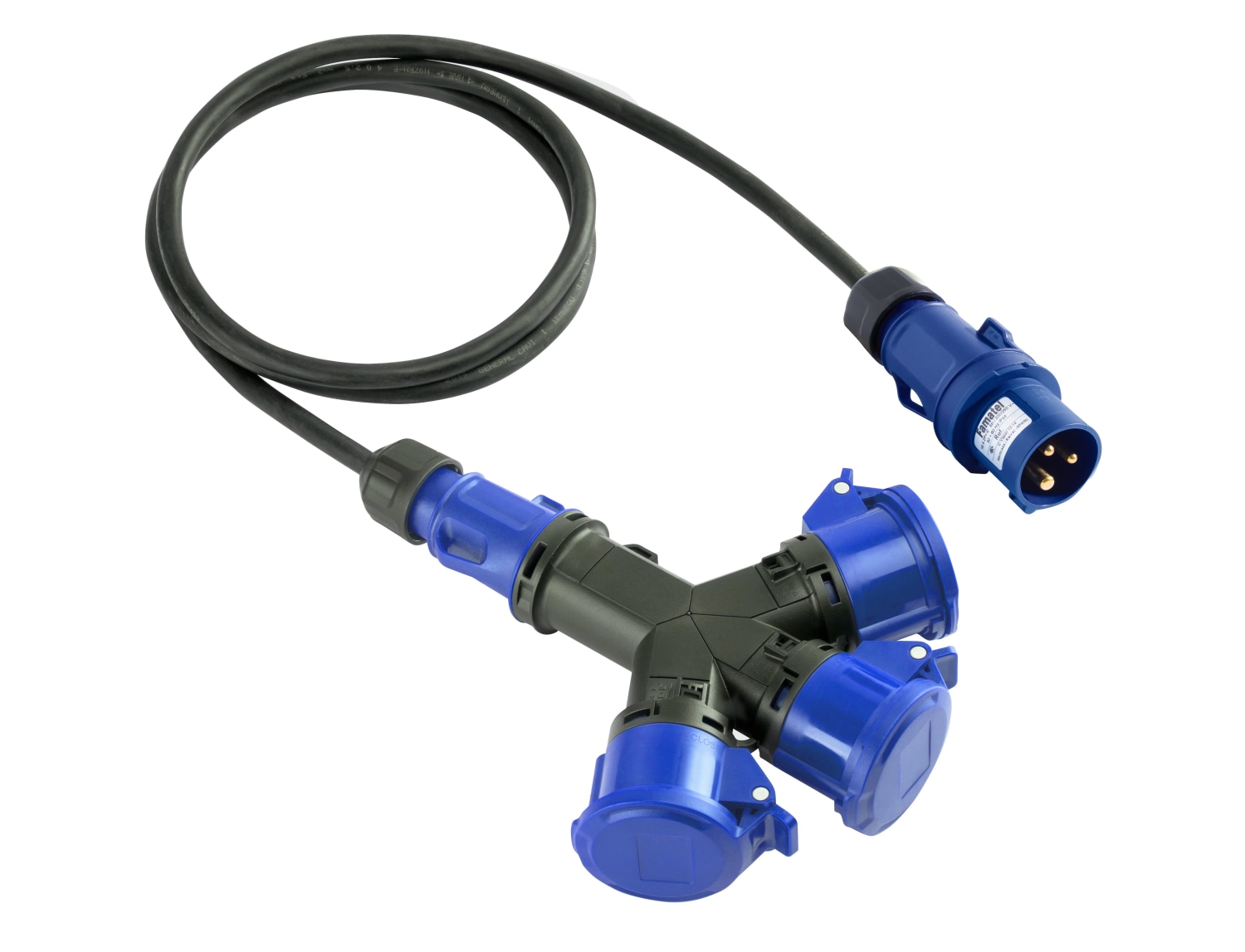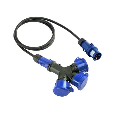 CEE fordeler med stikprop og 2 meter kabel samt 3 udtag. 3P 230V 16A Blå, IP54.