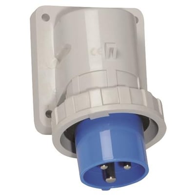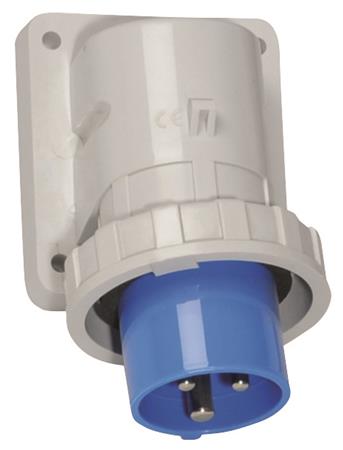 CEE panel indtag H6 230V 16A 3 polet IP67. Blå RAL 5015 med skrueklemmer. Flange 74x84 mm, fixing centers 58x64 mm.