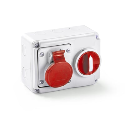 Vandret stikkontakt, 5P, 400V, 32A, rød. Med dobbelt mekanisk interlock, der forhindrer at der tændes for stikkontakten uden stikprop i. IP54.