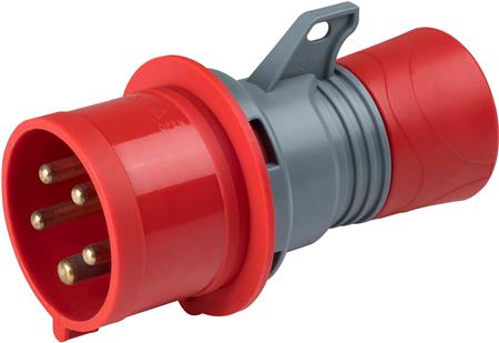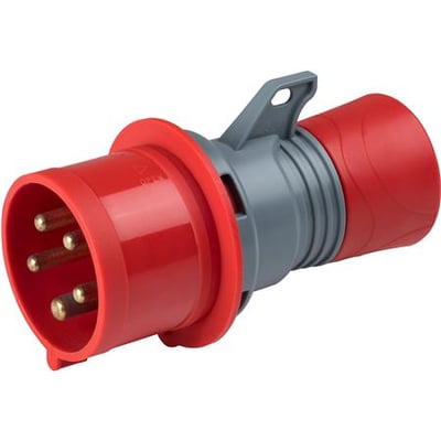 Stikproppen er en 5-polet model, hvilket sikrer en stabil og sikker forbindelse. Den røde farvekode indikerer spændingsområdet på 400V, hvilket gør den let at identificere i systemer med forskellige spændingsniveauer.