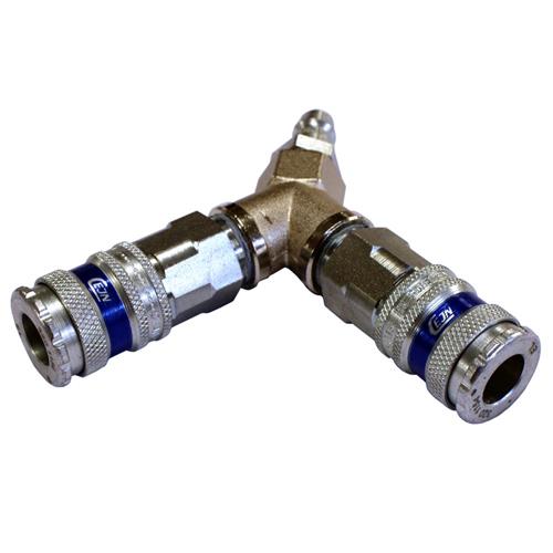 Cejn 320 Y-stykke med dobbelt kobling i stål/messing. Designet til højt flow og nem håndtering. Ideel til trykluftsystemer med arbejdstryk op til 16 bar.