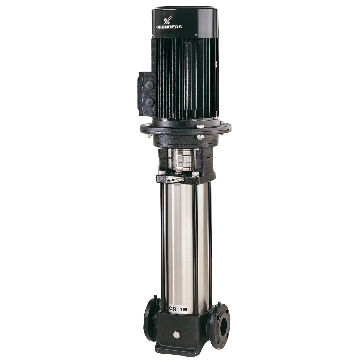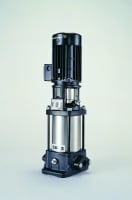 Vertikal, normalsugende, in-line flertrins-centrifugalpumpe til installation i rør og montering på fundament. Med løbere og mellemkamre i rustfrit stål.