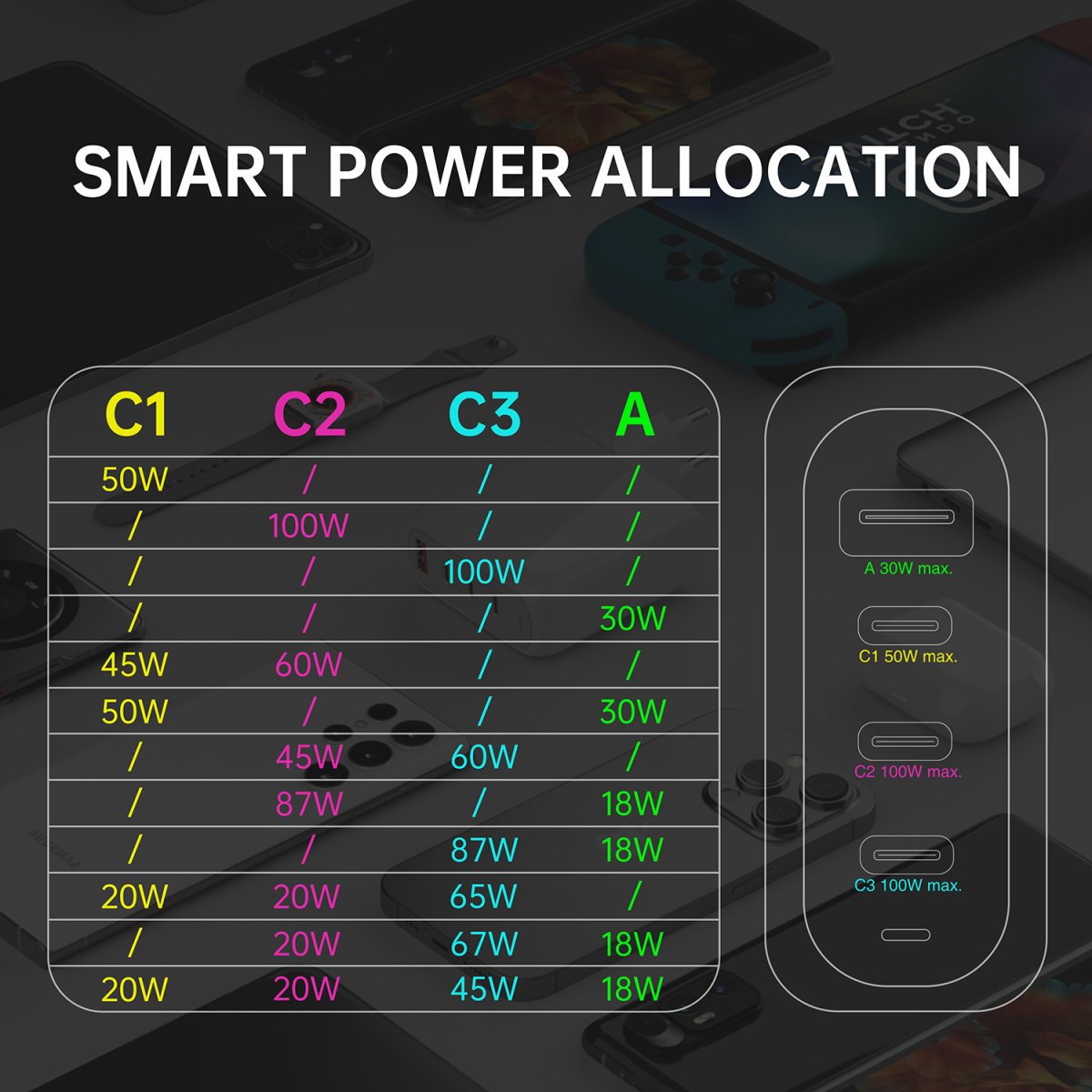 Takket være de mange porte kan du oplade flere enheder på samme tid. Du behøver kun én oplader til alle dine enheder.