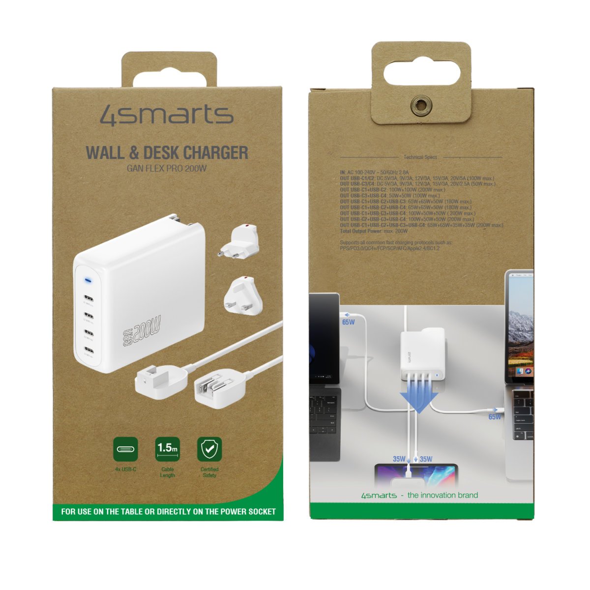 Oplad flere enheder samtidigt med denne 4Smarts Charger GaN Flex Pro. Den har 4 USB-C porte og en samlet effekt på 200W. Perfekt til rejser med udskiftelige EU/UK stik.