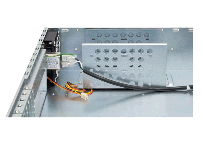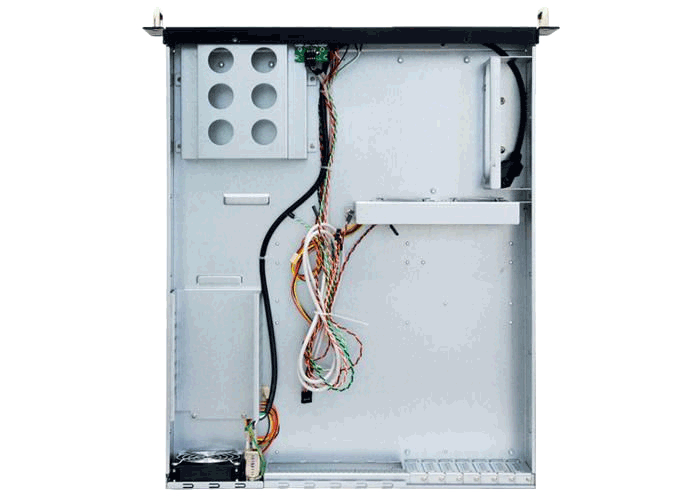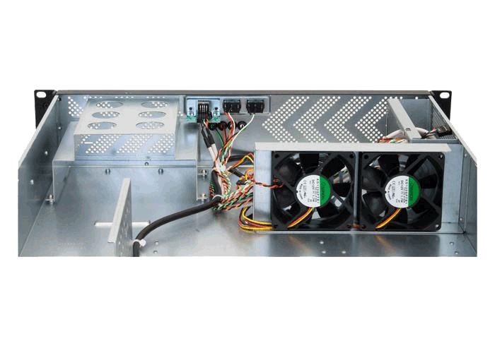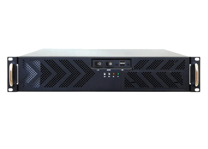 19" 2U UNC-210T-B-U3-OP rack kabinet med 400W PSU, understøtter ATX bundkort, har 4 x 3,5" og 1 x 5,25" drevpladser, i sort.