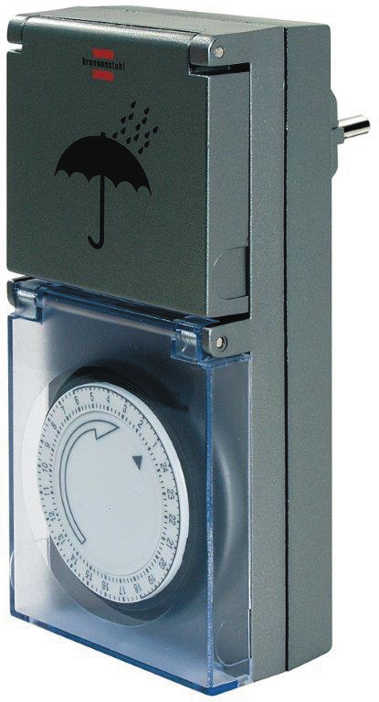 Mekanisk timer fra Brennenstuhl med IP44 beskyttelse, til indendørs og udendørs brug. Børnesikret kontakt.
