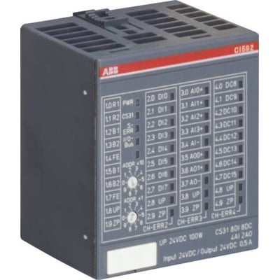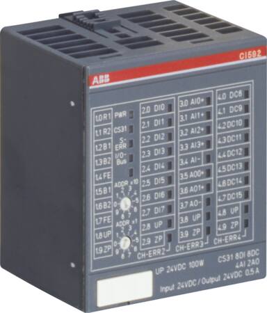 Interface-modul til CS31-bus. 8 digitale indgange, 8 konfigurerbare digitale indgange, 4 analoge indgange (U/I/RTD), 2 analoge udgange (U/I). 12Bit+sign, 1-leder.