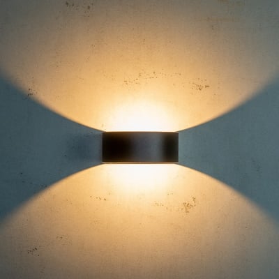 Elegant udendørs væglampe i mørk, ru, sort overflade. Giver et godt lys op og ned ad væggen. Passer til både moderne og klassiske vægge.