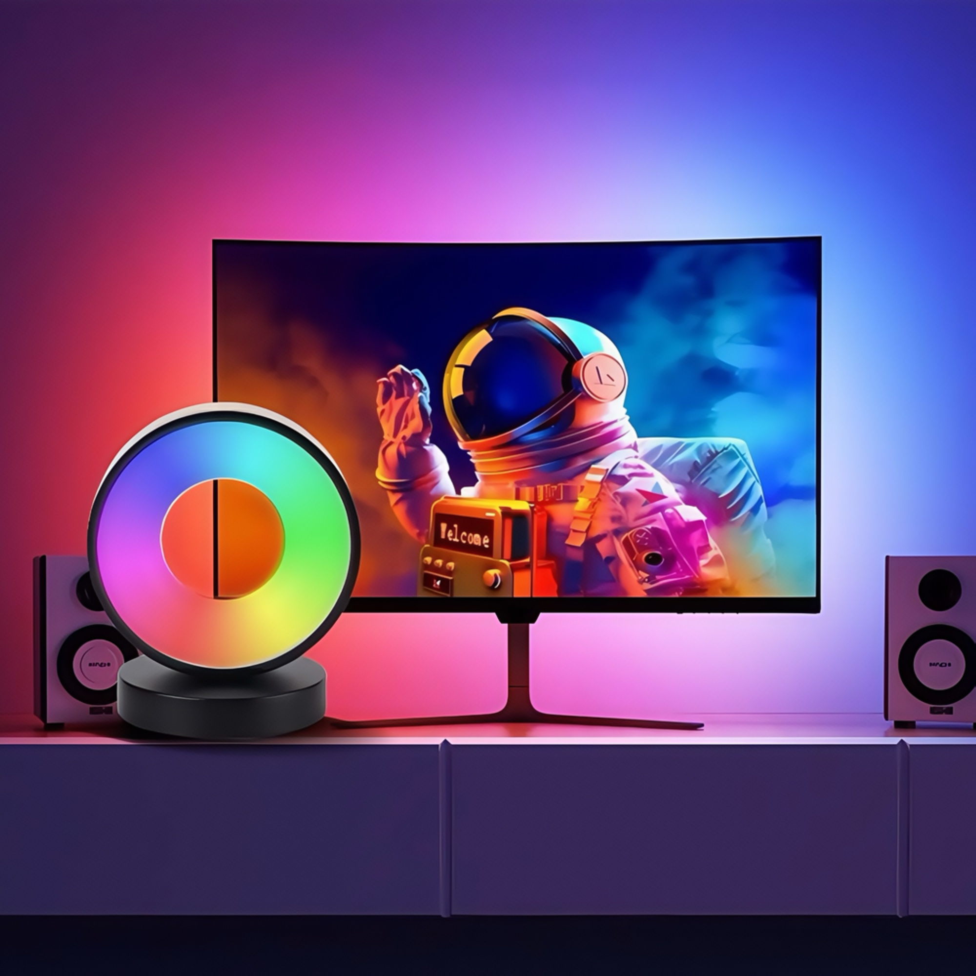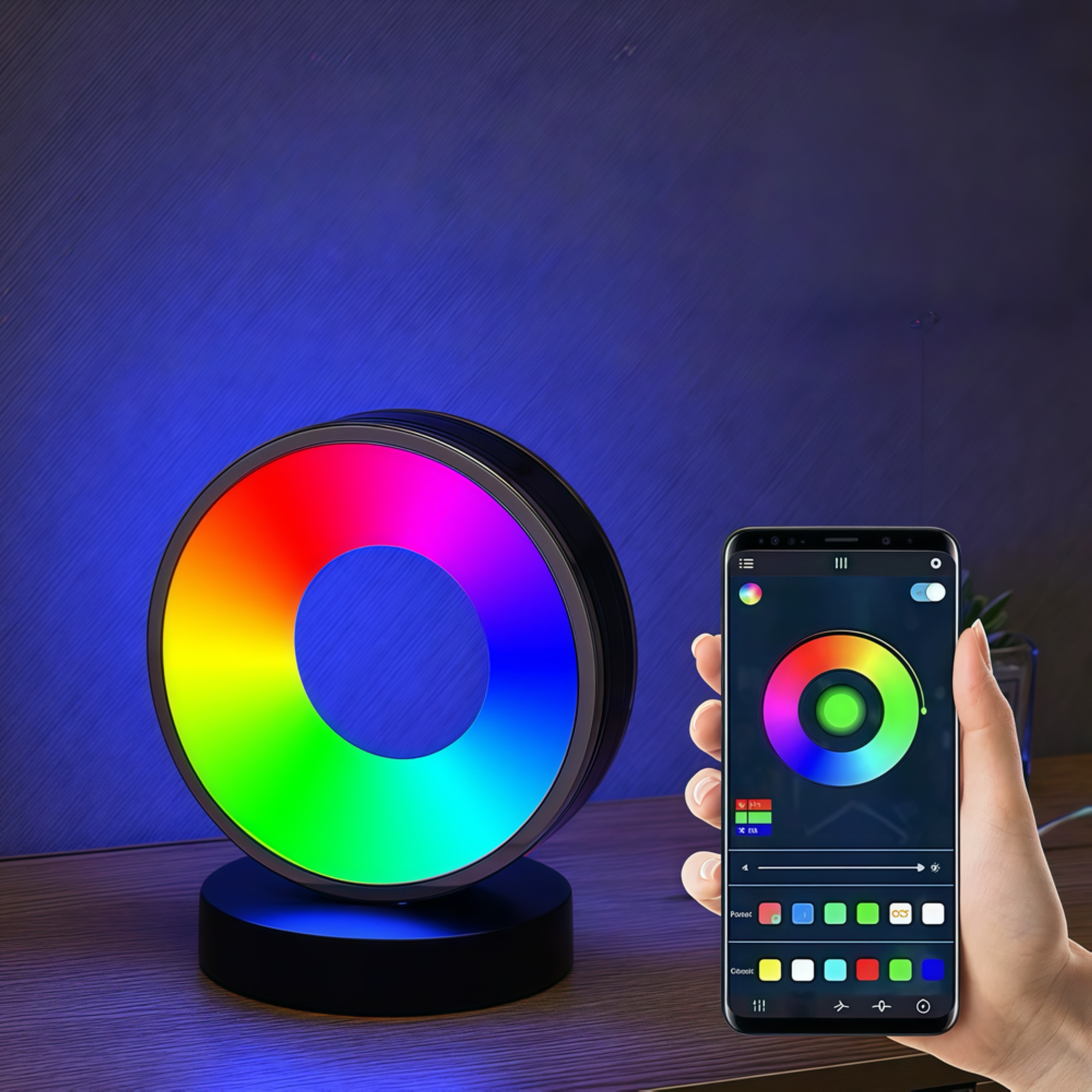 Skab stemning med denne cirkulære RGBIC lampe. 18x15cm, styres via Bluetooth og drives af 5V USB.
