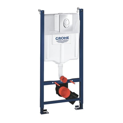Høj cisterne til indbygning med frontbetjening og forkromet plade. Passer til væghængte toiletter med bolthul 180-230mm. Mål: 1135 x 500 mm.