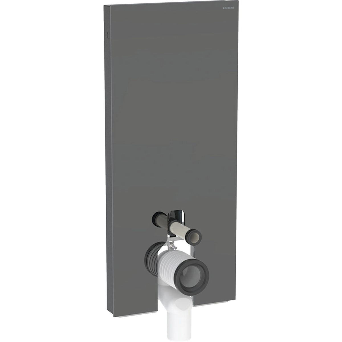 Geberit Monolith Plus cisternemodul til gulvstående toilet, 114 cm, med frontpaneler af glas lava og aluminium i sort krom. Betjening via soft-touch-knapper og mulighed for lugtudsugning.