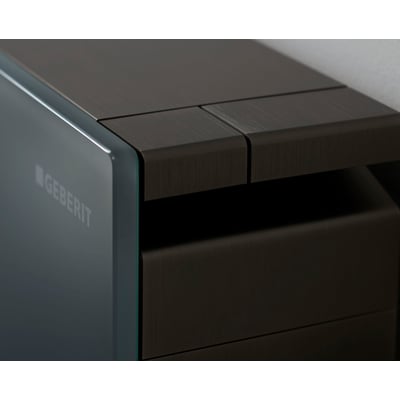 Geberit Monolith Plus cisternemodul til væghængt toilet. Med frontpaneler af glas i farverne glas lava og aluminium sort krom. Har dobbeltskyl, soft-touch-knapper og lugtudsugning.