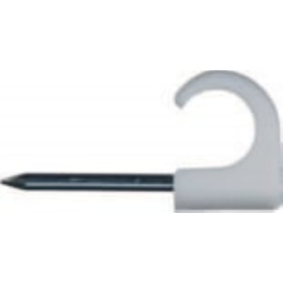 Hvid ledningsclips (10-14/30 mm) til træ og spånplader. Fremstillet i slagfast polypropen med hærdet, forzinket stålsøm. Tåler temperaturer fra -40°C til +80°C.