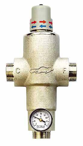 Termostatisk blandeventil 1 1/2" med udvendigt rørgevind og manometer. Kapacitet: max 270 liter pr. minut. Uden indbyggede kontraventiler.