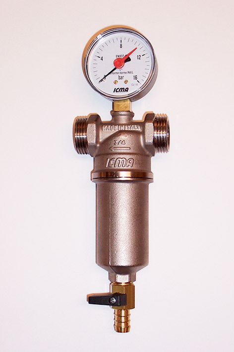 Filterhus i Tea-behandlet messing med AISI 304 stålvæv (100 mikron). Med manometer og kuglehane for udskylning. Max 90°C.