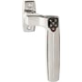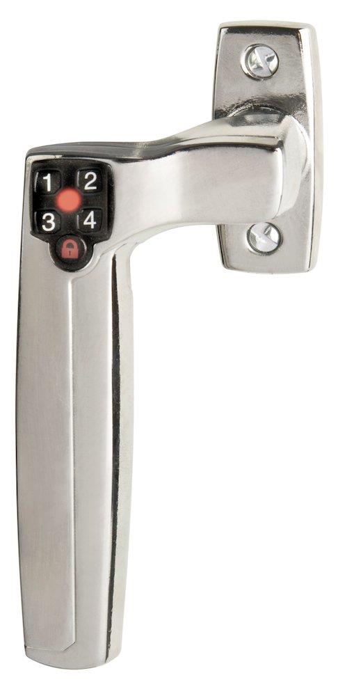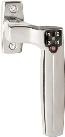 Terrassedørgreb til indvendig montage. Med indbygget tastatur til at kode grebet, så det blokeres i låst position. Betjenes let med rød knap og 6-cifret kode.