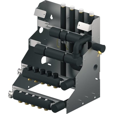 Bundmodul til Uponor Combi Port E / INS fjernvarmeunits og lejlighedsunits. Samler rørføring for kompakt installation i skab eller skakt.