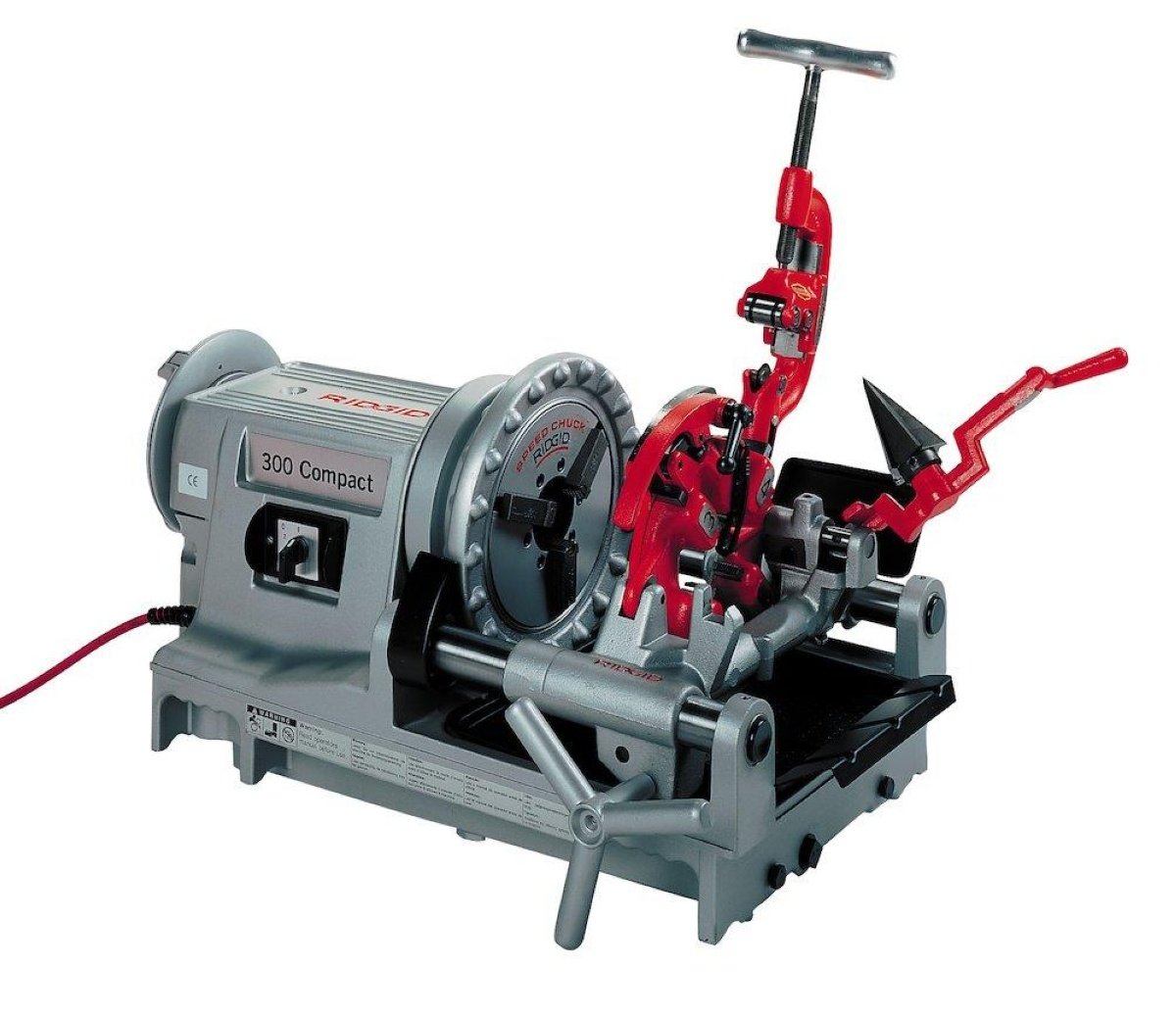 Ridgid Compact 300 gevindskæremaskine med 1,7 kW motor. Kapacitet: Rør 1/8 - 2" (6 - 50 mm), bolte 1/4 - 2" (6 - 52 mm).