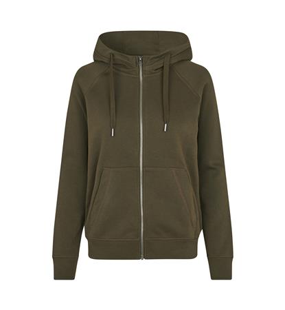 Klassisk hættecardigan til damer med kængurulomme, gennemgående lynlås og high-cut halsafslutning. Fremstillet i kraftig kvalitet med blød, børstet inderside.