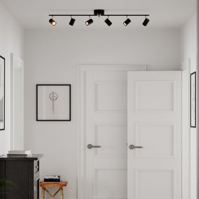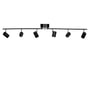 De seks lampehoveder er udstyret med GU10 fatninger, der understøtter op til 7W LED pærer (medfølger ikke). Skinnen fås i hvid, sort og en flot mat guld lakering.