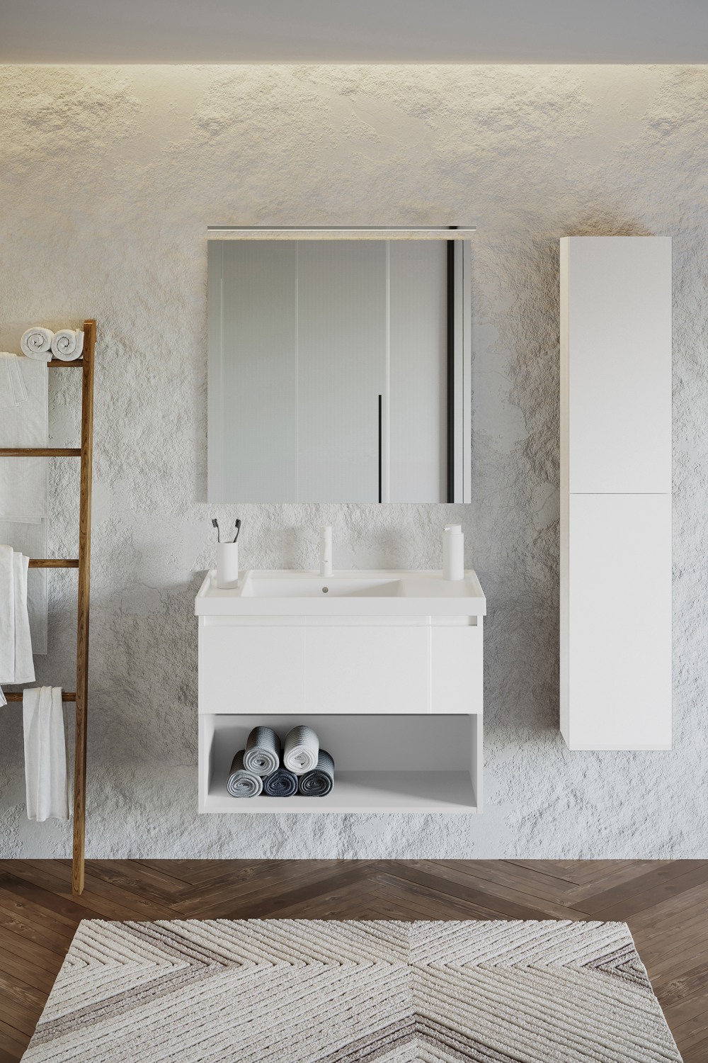 Underskabet har en praktisk indretning med en skuffe og et skab, der giver rigelig plads til opbevaring af dine badeværelsesartikler. Den integrerede vask i Teckstone komplementerer underskabets design og sikrer en ensartet og stilfuld æstetik.