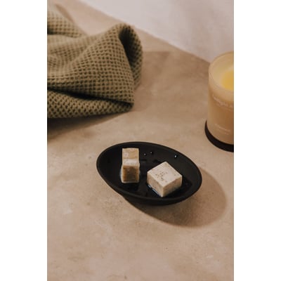Elegant sort sæbeskål med mat overflade. Mål: 129,3 x 102,9 x 37 mm. Fremstillet i holdbart materiale.
