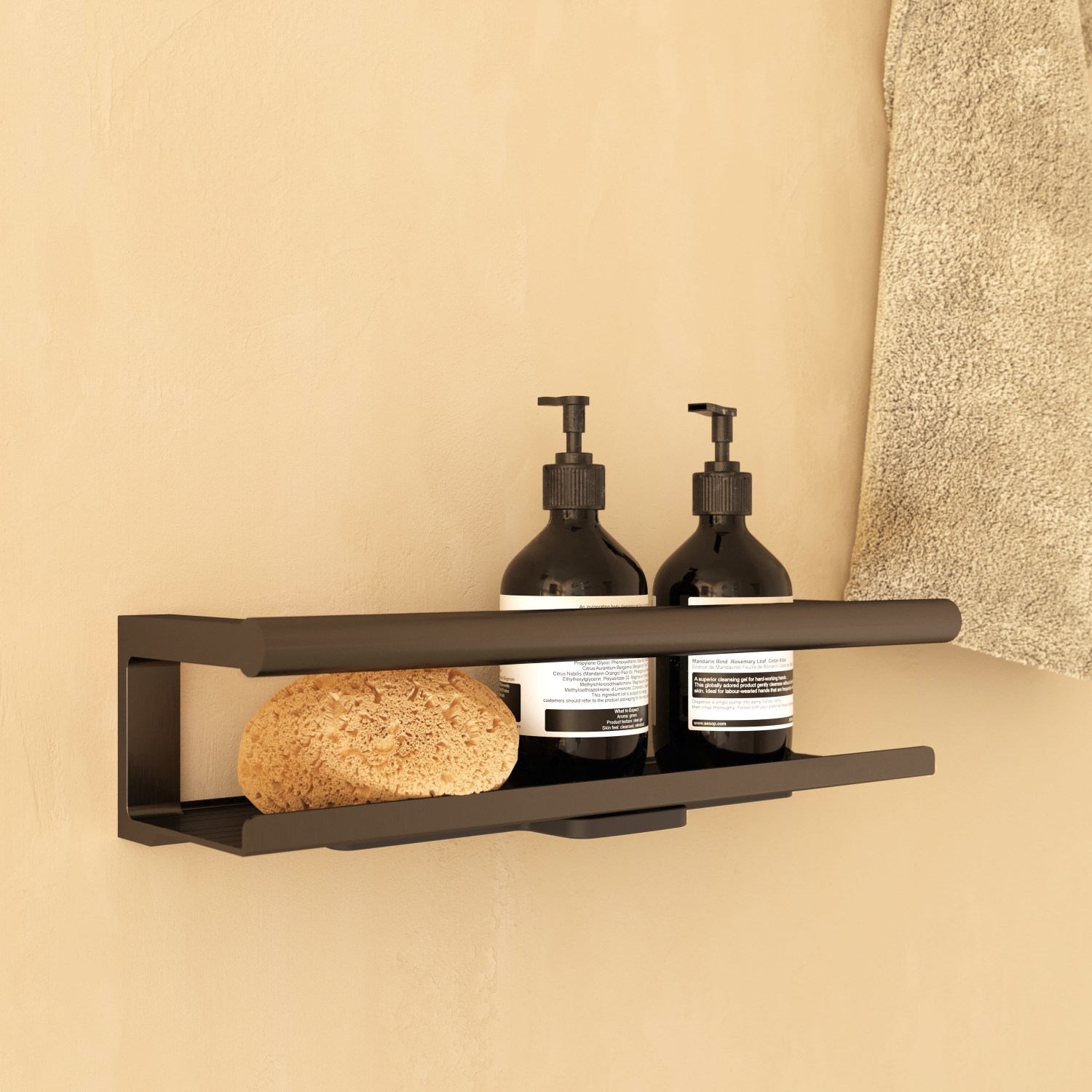 Praktisk brusehylde i sort mat finish. Inkluderer integreret glaskraber for nem rengøring.