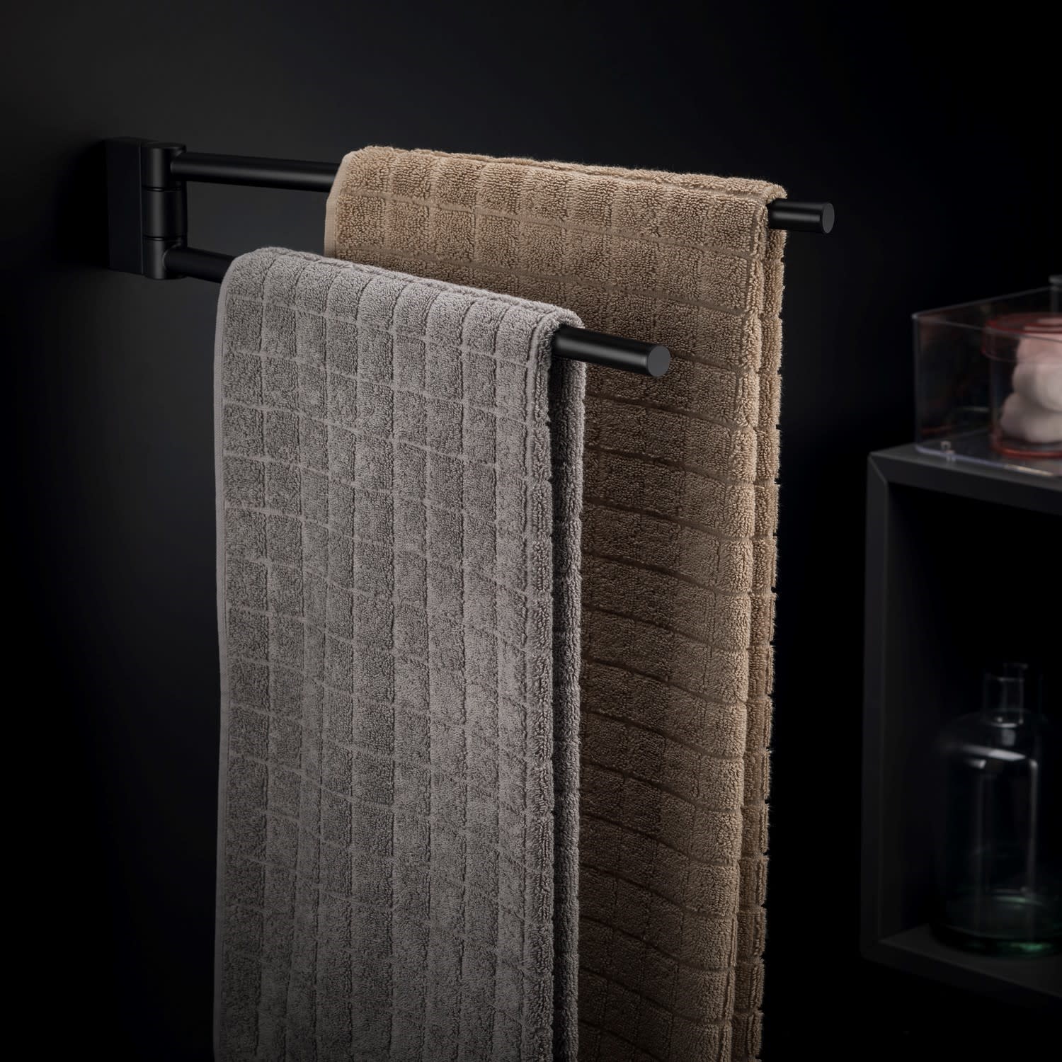 Smart og stilren dobbelt håndklædeholder i sort mat finish. Perfekt til at organisere dit badeværelse.
