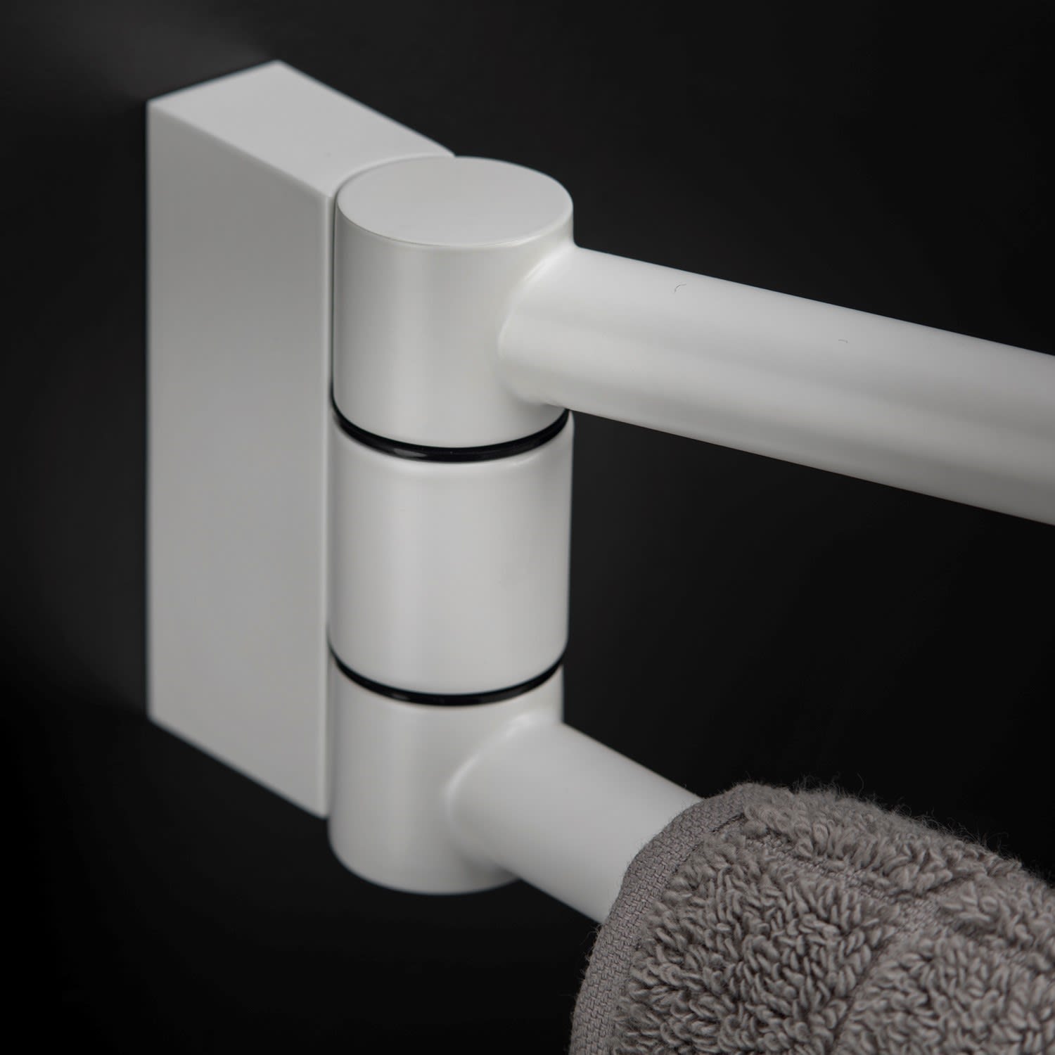 Praktisk og stilfuld dobbelt håndklædeholder i mat hvid. Nem montering og pladsbesparende design.