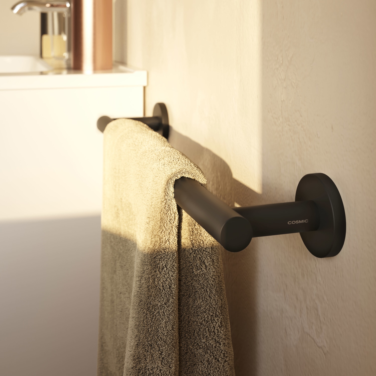 Denne Cosmic håndklædeholder kombinerer funktionalitet med et moderne, minimalistisk design. Med sin matte sorte overflade og rene linjer passer den perfekt ind i ethvert stilfuldt badeværelsesmiljø.