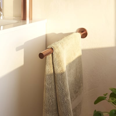 Stilfuld håndklædeholder i børstet kobber. Mål: 55 mm (B) x 400 mm (D) x 55 mm (H). Perfekt til badeværelset.
