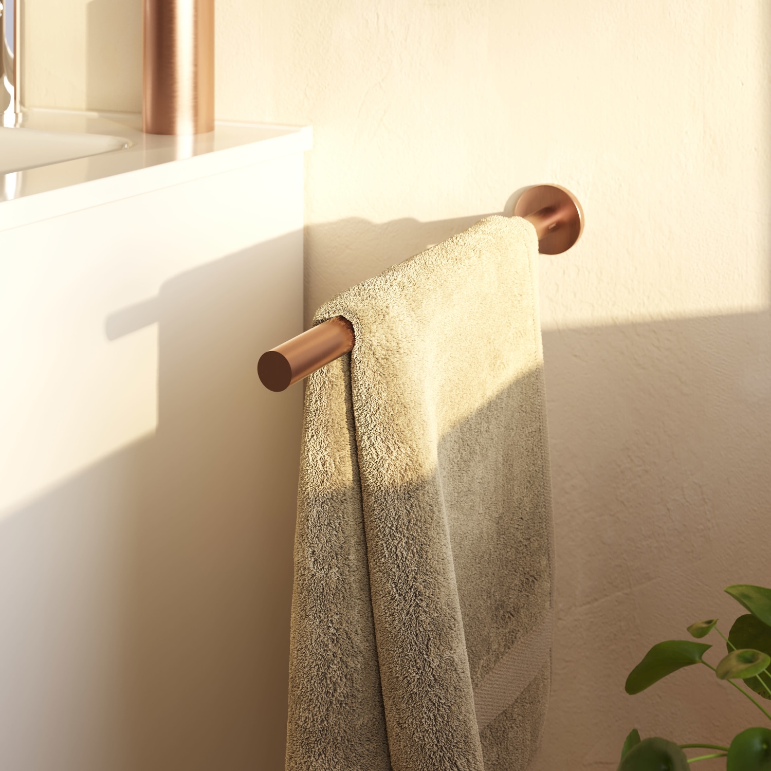 Denne håndklædeholder fra Cosmic kombinerer funktionalitet med et elegant design. Den børstede kobberoverflade giver et luksuriøst look og passer perfekt ind i moderne badeværelsesindretninger.